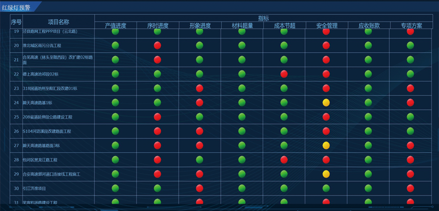 6.所有項目從產(chǎn)值進度,序時進度,形象進度,材料超量,成本節(jié)超,安全管理,應(yīng)收賬款,專項方案等維度自動進行紅綠燈智能預(yù)警,項目風(fēng)險一目了然。