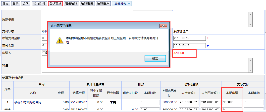 3.每次付款時系統(tǒng)自動統(tǒng)計出前期累計支付量和累計結(jié)算量,并對比合同履約條款應(yīng)該支付比例,如果超支系統(tǒng)自動報警。