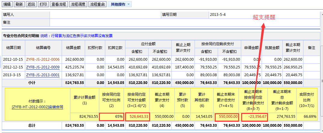 3.每次付款時系統(tǒng)自動統(tǒng)計出前期累計支付量和累計結(jié)算量,并對比合同履約條款應(yīng)該支付比例,如果超支系統(tǒng)自動報警。
