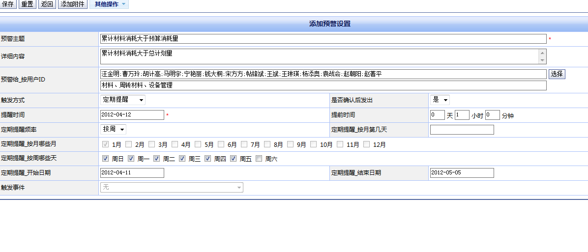 2.預警可以多種出發(fā)機制,包括一次提醒、定期提醒、按事件提醒、自動發(fā)出、確認發(fā)出等;